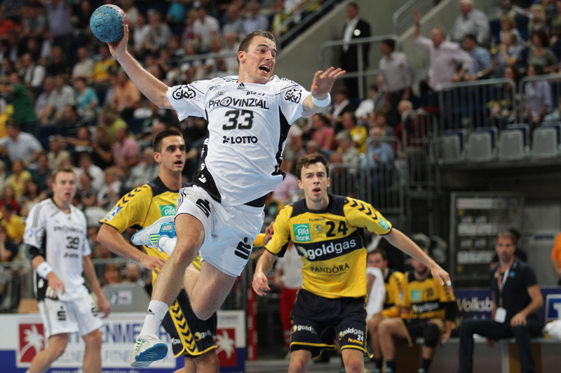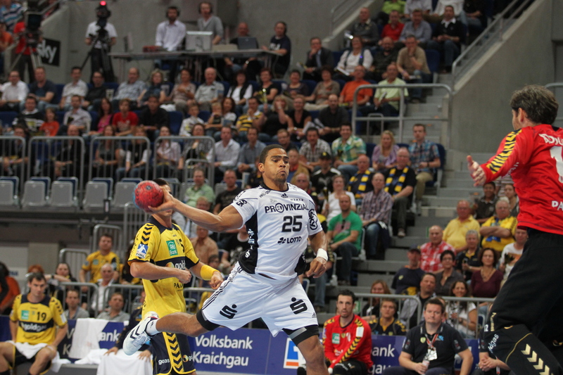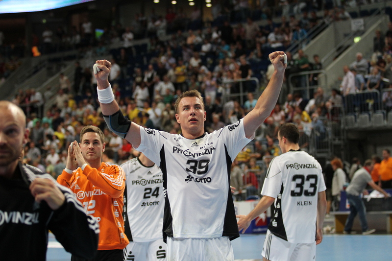 | Thierry Omeyer stürmt Richtung Löwen-Tor. | Daniel Narcisse. | Dominik Klein. | Börge Lund und Christian Zeitz. | |||